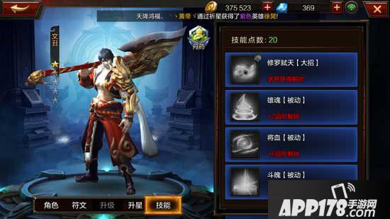 1、修罗弑天(大招):文丑使用大招后,大幅提升自己物理攻击100%,持续十秒