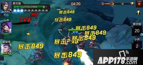 蔡文姬的大招是法系输出的典范,“悲风鸣月”可以向一个方向施加一个AOE的高额法术攻击伤害。这个伤害确实很高,很高,很高,重要的事情说三遍。有多高?可以看图中的数字,在27这个等级,普通攻击打到这些小兵身上的伤害大约在160左右,而“悲风鸣月”可以达到849的暴击伤害。当然,这个技能也很容易空,容易空,容易空,重要的事情说三遍。所以“悲风鸣月”的释放时机是有讲究的,最好是接在控制技能之后,这样可以保证100%命中。