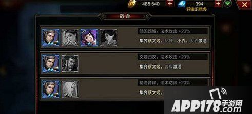 蔡文姬的宿命搭配只有三个。作为一个靠法术打伤害的武将,当然加强法术攻击是一个最为合适的选择。而加强法术攻击有两种不同的宿命,分别是“倾国倾城”和“文姬归汉”,这两种宿命可以提供的效果都是“法术攻击+20%”,这20%的法术攻击增益对于蔡文姬来说是如鱼得水。可以明显看到,“倾国倾城”需要4名武将,显然更不容易达到。