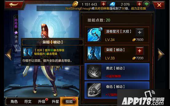 【被动】勇武,永久提升孙尚香的武力。【属性】永久提升武力,每级提升0.2武力
