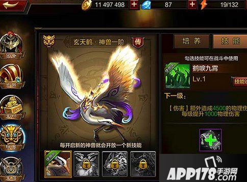神兽分为一阶、二阶、三阶、四阶直到十阶,每个品阶的神兽形象不同。每开启新的神兽,就会开放一个新技能。升级技能需要消耗荒兽卷轴,通过活动获得。通过对神兽的升星突破,可以提高神兽的品阶,从而提高主公属性加成。升星花费的材料是万灵血精,获得途径是远征商店、云游商人和神秘商人。