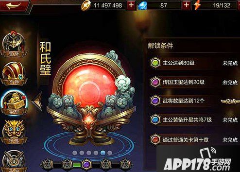 每个主公有七星灯、倚天剑、赤兔、传国玉玺、和氏璧、青焰麒麟六大宝物。每个宝物都会有一定的属性加成。每个宝物都有其升级所需要的固定的材料,该材料可以通过经典战役或者钻石购买。每个宝物有一定的解锁条件,满足全部条件后,才可以激活使用。