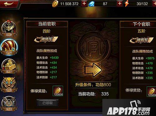 每个主公都有一个官职,不同品阶的官职,能够提供的属性加成不同。每个官职每天可以领取一次金币的俸禄奖励。提升官职需要消耗功勋币,功勋币的获得通过日常任务和群雄争霸两个途径。