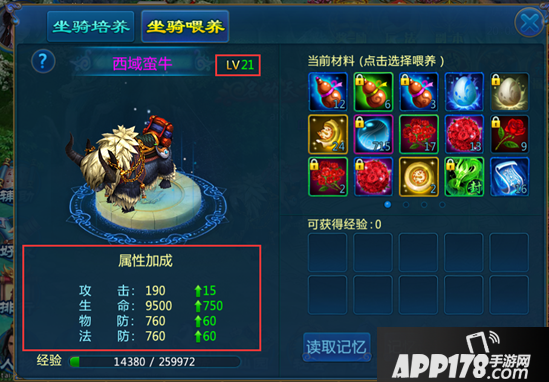 1、点击该道具栏中的物品,再点击喂养,即可以对坐骑进行喂养,道具的品级越高,获得的经验也越多