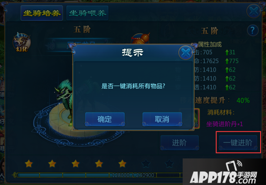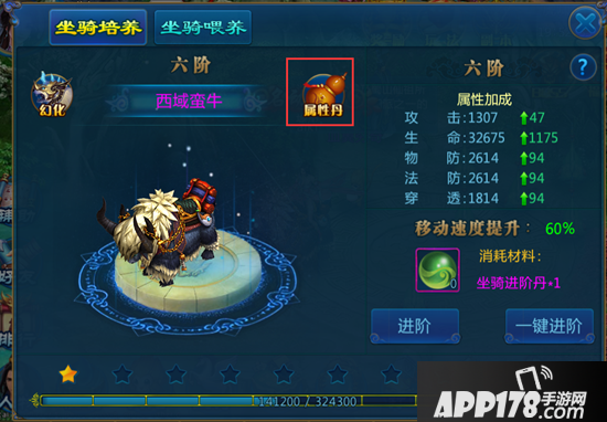 2、坐骑进阶培养分为一键进阶和普通进阶两种,点击进阶按钮会使用一个坐骑进阶丹,一键进阶则会使用全部坐骑进阶丹,若坐骑进阶丹足够多,则会在进阶成功后停止使用剩余的进阶丹。