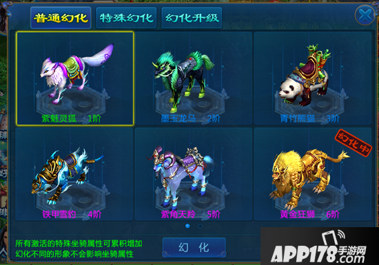 1、坐骑每升级一阶,可以幻化一个新的形象,玩家可以点击“幻化”选择自己喜欢的坐骑外形进行幻化。