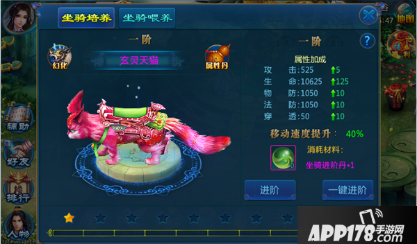 坐骑可以通过进阶、喂养、属性丹、幻化四种方式来提升属性。进阶需要花费坐骑进阶丹,喂养可以通过投入游戏道具来实现,属性丹可通过使用不同的坐骑属性丹来提升坐骑的属性;幻化可通过激活不同外形的坐骑来提升坐骑的总属性。