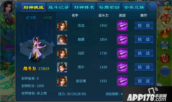 (1)封神挑战:玩家消耗1点活力可进行一场挑战,挑战成功会获得金劵积分,同时排行也会上升。在每周日的奖励结算时,排名靠前的玩家会获得丰厚的结算奖励。