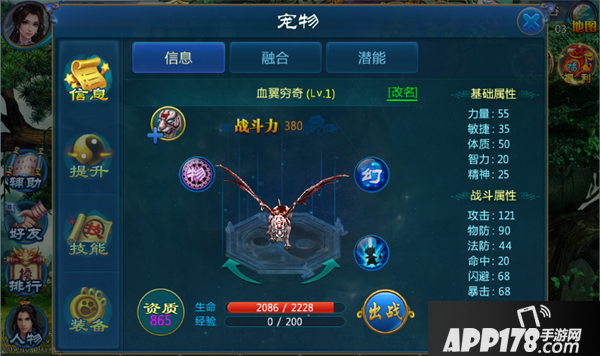 (1)信息:信息栏包含宠物列表,幻化功能,资质展示,生命/经验值,是否出战。点击出战/休息按钮,可以将宠物放出或收回。当玩家拥有幻化列表中的宠物时,可以开启该外形的幻化权限。将出战的宠物幻化成对应的外形。