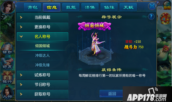 (1)点击人物—信息—称号,可以到达称号界面。
