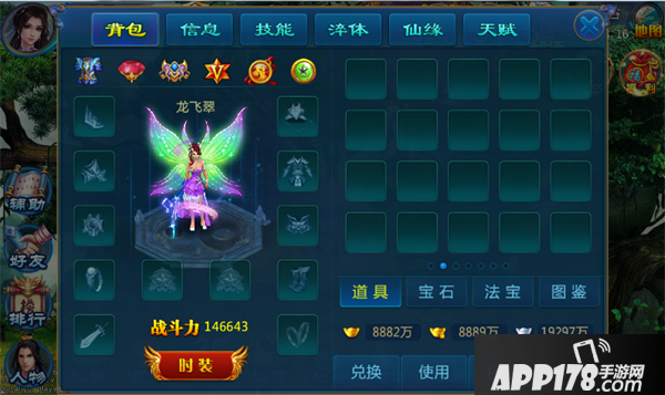 (1)背包:查看背包内道具,包括道具、宝石、法宝、图鉴背包。