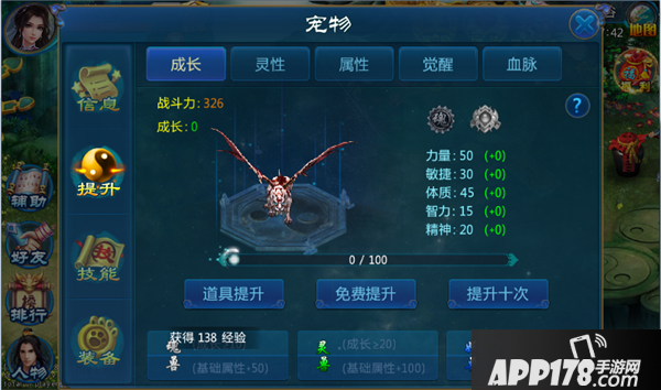 (2)提升: 宠物提升包含灵性和血脉等部分。宠物灵性的提升影响基础属性的提升。灵性值达到不同阶段时,可以获得额外的属性加成。宠物觉醒阶数越高,宠物战力越强。