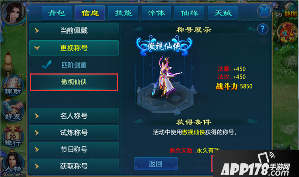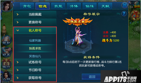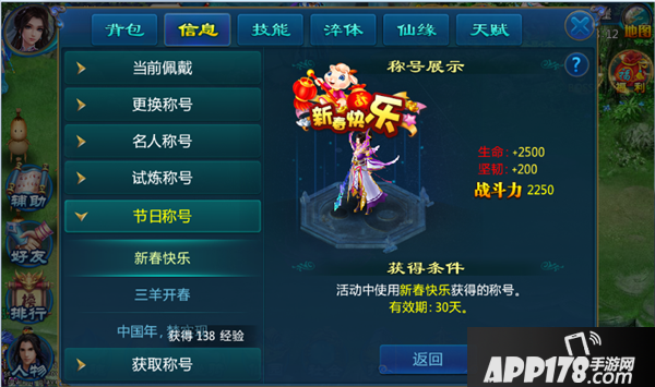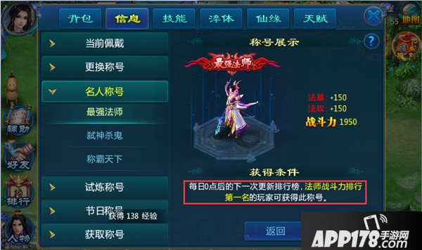 玩家可通过排行榜、玩法、节日活动获取各种称号。不同称号有不同的属性,所有称号的属性可以叠加,这意味着收集到的称号越多,玩家的属性、战力就越强。