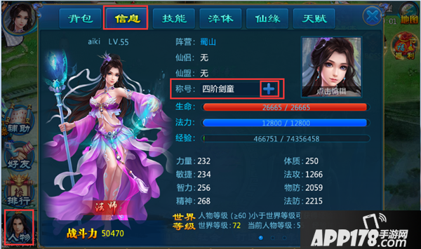 1、在人物—信息界面处,点击称号后面的“+”号,即可进入称号界面