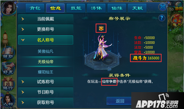 通过游戏玩法获得的称号,例如仙帝争霸系统、结缘系统、剑仙基金都有称号产出。最值得一提的就是仙帝争霸的称号,该称号虽然外形娇小,却蕴含着强大的力量,获得最强的无极仙帝称号,可获得高达16万的战力加成。