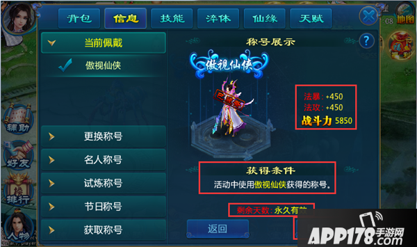 2、在当前佩戴栏,可以查看称号的属性、增加的战斗力、称号的有效期及获取条件,对于那些低调的玩家,还可以隐藏称号。