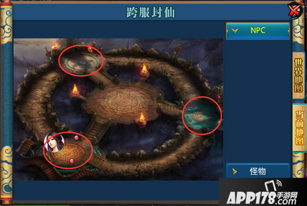 下图是封仙战场的地图,圆圈表示不同阵营的出生点,在出生点会有强大的守卫,保护在出生点的玩家。