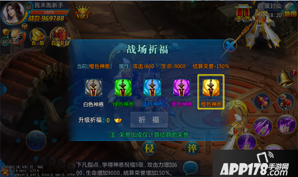 点击进入战场后,会被随机分配去某一个阵营(一共3个阵营;出现祈福界面,点击祈福后消耗元宝,获得强大的人物属性加成与结算荣誉加成,这样可以帮助玩家获得更好的战绩与更多的结算荣誉。