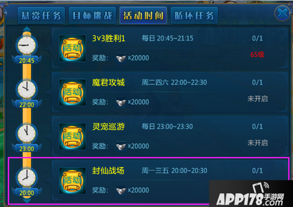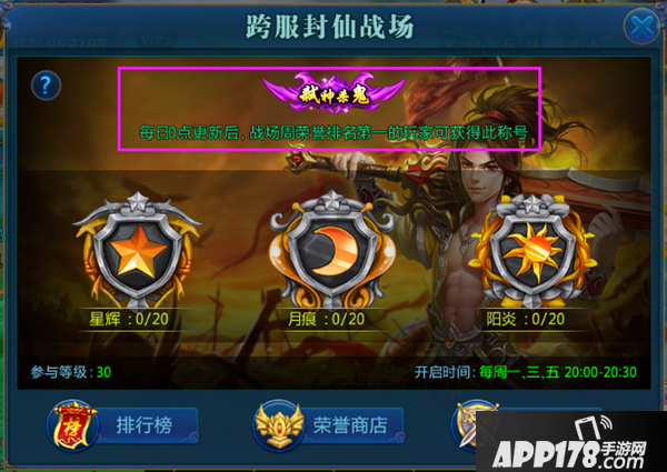 在每周一、三、五的晚上20:00-20:30分,是封仙战场的开启时间,等级大于等于30级的玩家可以进入该战场进行厮杀,战场荣誉排名第一的玩家还可以获得独一无二的绝版称号!