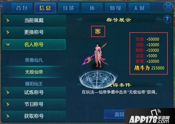 夺得仙职可以增加不同的人物属性,仙职越高所能增加的属性越高。同时获得仙职头衔的玩家人物名字后会显示对应仙职图标,拥有仙帝称号的玩家每次登录游戏还会有全服广播通告。