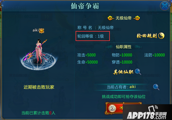 若仙职无占领者,玩家可直接挑战仙职boss,战胜后替换boss成为仙职。每次被挑战成功 后,boss的轮回等级会加1,战斗力提升,后续挑战该职位的玩家需要挑战最新boss成功方可替换前一个玩家获得该仙职。