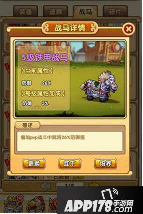 2、虽然品阶高很重要,但也不是随便一个品阶高的战马都适合玩家们的武将,玩家们必须根据自己武将的属性等,综合考虑,合理搭配,比如经验加成、技能加成之类的,考虑好了,再进行培养。