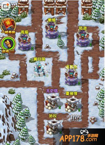 开始什么都不做,等到左边和右边的怪走到夏侯位置交汇时诸葛会放技能定住(周瑜的话就是减速)这时候鼓舞上面随便一个炮,鼓舞结束马上鼓舞孙权,控制的好差不多能卡在中间,接着会来马,把积聚的10点能量放个冰雨,卡在中间后面就简单了。