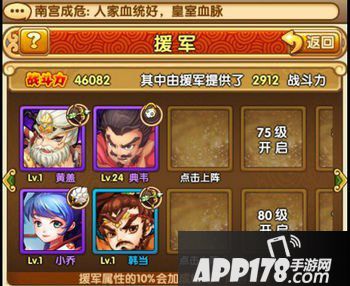 2)援军的选择武将上阵的列表里显示已在阵容或已在援军的武将(武将可在援军和阵容界面里相互调整)。