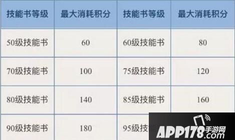少侠可根据需要赠送的技能书等级对照,获得需要消耗的最大积分。