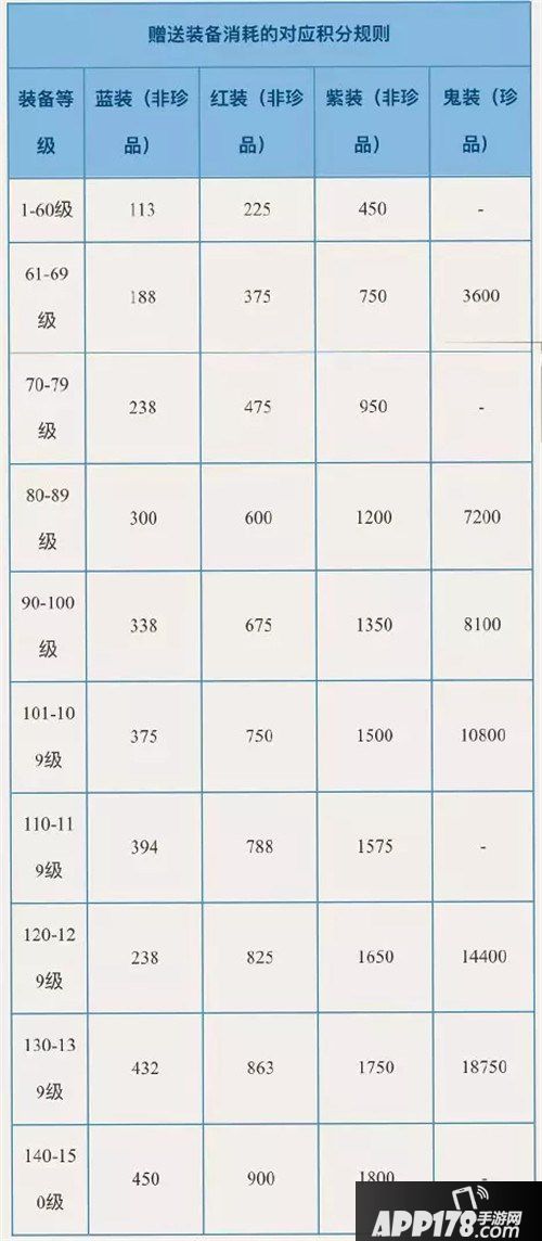 注意:珍品蓝、红、紫装消耗的受赠积分为下表普通蓝、红、紫装对应积分的3倍。