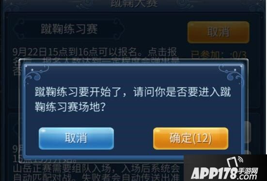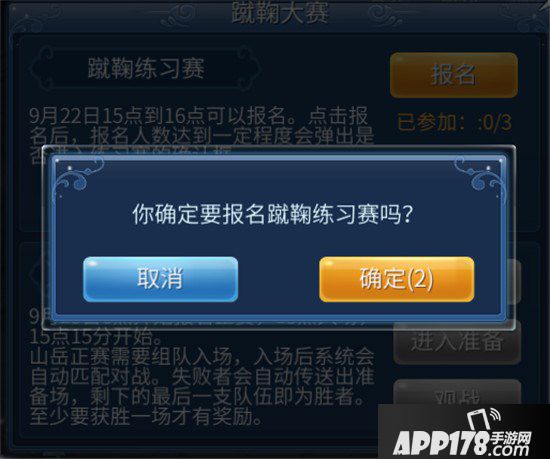 大于等于50级玩家打开活动-节日活动-蹴鞠练习赛报名(练习赛每日可参加3次,山岳正赛每人可以参加一次)