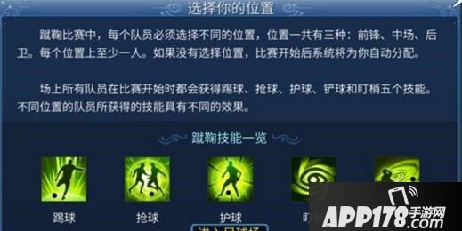 择好位置后,玩家将被给予一套蹴鞠技能,并在开球前被系统送入自己应处的位置上。蹴鞠技能一共分为五种技能,分别是:传球,抢球,护球,铲球,盯梢。用好这五种技能是关键,安安我刚开始玩的时候也是一脸蒙逼的。