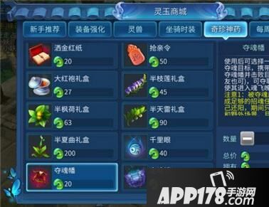 夺魂幡:售价20灵玉/280元宝,使用道具可从仇敌列表中设置1个夺魂对象,设置后有效期为12小时。每日最多使用5个,无法对帮会宣战中的玩家生效。