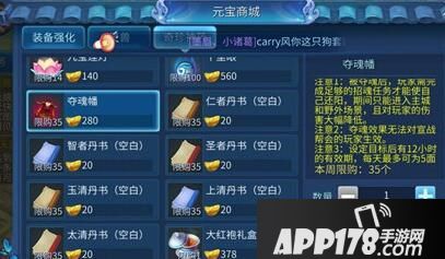 在系统的灵玉商店中,新增加了两样道具,分别是60灵玉的定魂锁和20灵玉的夺魄幡(元宝商城也有卖夺魄幡)。定魂锁,使用后可以一小时免疫夺魄效果,土豪必备。而我们要进行夺魄的必备道具就是夺魄幡,点击使用后输入你想要夺魄的玩家名字即可。有效期12小时,每天限用5次。只要在限定时间内野外击杀该玩家就可以成功夺取其魂魄。在夺取成功后,再次点击道具可以观看此玩家的招魂情况。发现活了后如果觉得不解气,你今天还有4次机会。。。