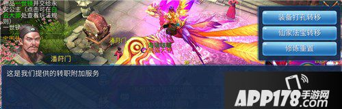 1、转职成功后,点击金陵NPC潘莳门,点击“转职附加服务”——"仙家法宝转换",打开仙家法宝转换界面: