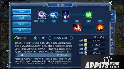 【风入松】:掉气血上限,前置技能,我27级都是初期点的,后期不需要点。