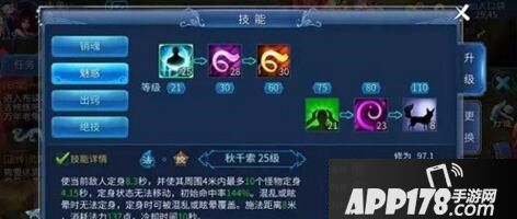 【秋千索】:前期控制技能,配合天赋技能声声慢概率出现沉默效果,配合天赋技能定风波概率出现束缚效果,PVP必带技能,建议点高。