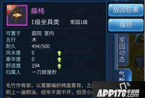► 由玩家本人放入的装饰物上带有图标标识。玩家可以对自己放入的装饰物进行取出,维修,装修等操作。也可以对对方的装饰物进行维修和取出操作,但不能进行装修操作。气数装饰界面的右边显示了家园的风水豪华舒适“三度”的数值,以及玩家当前气数/气数上限。这些数值随着放入的气数装修物的数值而变动。实际的气数装饰物的数值,还要受到装饰物本身五行与家园五行的关系影响。如果装饰物本身五行和家园五行一致,则其效果提升20%。
