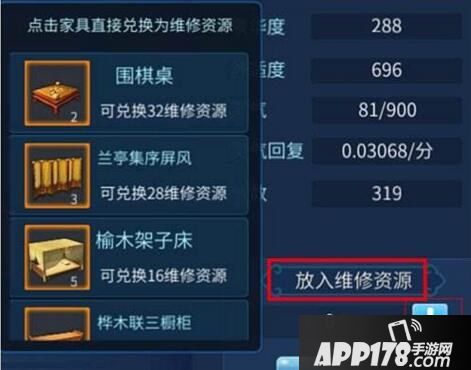 ► 维修时,玩家可以点击单个家具上的维修按钮,进行单个家具的维修,或者点击“一键维修”,可以直接消耗维修资源,将家园中所有耐久不足的家具维修成功。