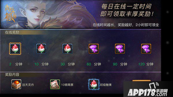 玩家持续在线一定时间后可领取在线礼包,在线礼包分成6个档次,分别为在线2分钟、10分钟、30分钟、60分钟、90分钟、120分钟,福利也是相当不错,其中包括银两、药品、绑定钻石、稀有魅果这些经常需要使用的消耗品。每天上线两小时,就可以领取全部在线礼包。