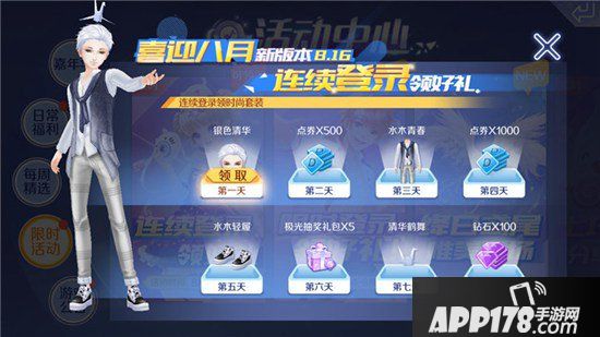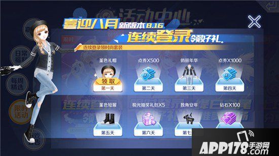 在更新了八月新版本后,玩家登录游戏时,系统会自动跳出来“喜迎八月新版本,连续登陆领好礼”的活动,通过连续登陆游戏,可以依次领取相应的奖励。第一天登录游戏可以领取发型,第二天可以领取500点券,第三天可以领取服饰套装,第四天可以领取1000点券,第五天可以领取鞋子,第六天可以领取5个极光抽奖礼包,第七天可以领取头饰,第八天可以获得100个钻石,奖励是不是非常丰厚呢!