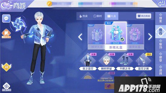 在8月17日至9月14日,登陆QQ炫舞手游商城中可以看到这款折纸情侣套装。男生打开这款折纸礼盒有机会获得“夜之蓝空”服饰、“瞬时停留”发型、“千鹤之寻”鞋子和“蓝空之翼”光效等。男生的发型为银色偏分短发,上装为白色衬衫搭配蓝色渐变外套,黑色的裤子搭配蓝色渐变色的短靴,整体服饰效果都是比较幽静时尚的,手持是一个光效风车,沉稳中不失童心。