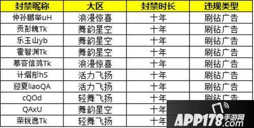 炫舞大陆里的黑产工作室发布虚假广告,虚假代充,严重影响舞者的游戏体验,危害财产安全。在舞者们和小白的共同努力下,近期对322个黑产刷钻小号进行了全区封禁10年的处罚。处罚账号公示如下(部分):昵称特殊字符显示不清or无法显示。如有雷同纯属巧合