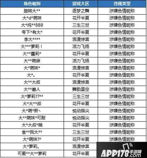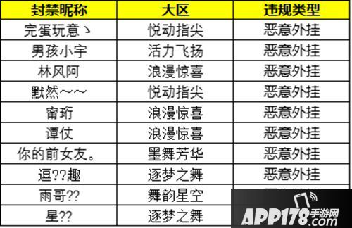 小白最近还收到舞者反馈,说有违规玩家恶意使用色情昵称,严重影响游戏环境。在接到反馈后,小白立马对恶意色情昵称进行了调查与分析,对涉及色情昵称的玩家,进行了重置角色昵称的处罚。处罚账号公示如下(部分):昵称特殊字符显示不清or无法显示。如有雷同纯属巧合