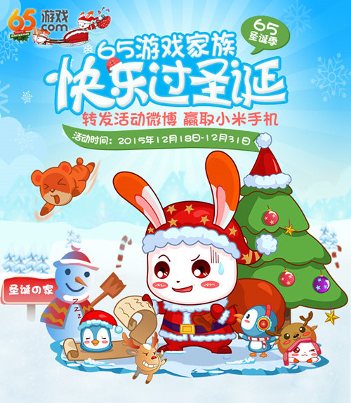 2015年12月18日——12月31日期间,65游戏家族成员,转发65圣诞季活动微博,就有机会赢取小米手机与游戏礼包!哇,这礼物,是不是比圣诞大餐更诱人!Everybody,快转发起来!