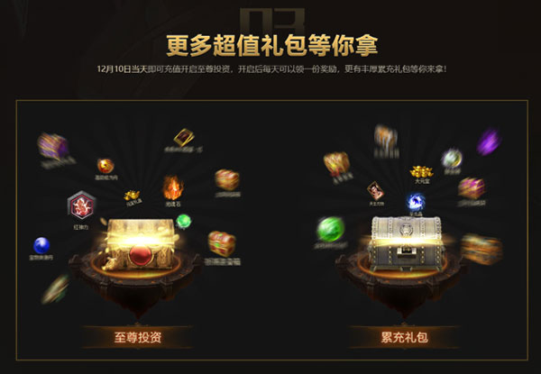 12月10日公测当天,在游戏内充值,即可开启至尊投资礼包,开启后每天可以领取一份奖励;同时游戏中还有丰厚的累充礼包,助你开启全新征程!