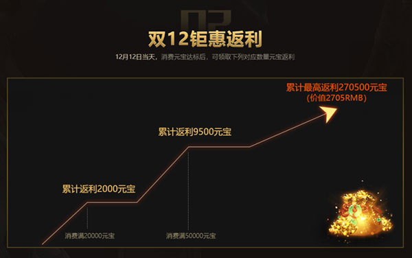 12月12日当天,消费元宝达标后,可领取下列对应数量元宝返利,累计最高返利270500元宝,足足价值2705RMB!这个双十二,我们用诚意让经典再现,用真情让兄弟齐聚。