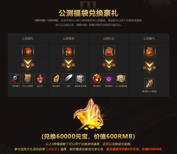 玩家参与龙凤大礼活动获得【点金手】道具,即可将福袋兑换成元宝礼包,单日最高可兑换6万元宝,价值600RMB!