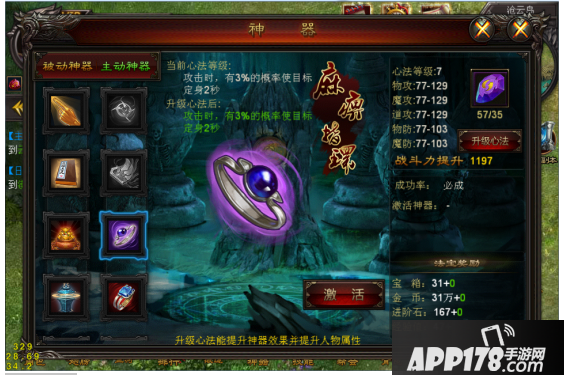 玩家激活神器后,可以使用神器进阶石来升级心法等级,提升心法等级可以加成角色物攻、魔攻、道攻、物防、魔防属性,从而提升一定的战斗力。神器进阶石可以通过击杀世界BOSS和60级怪物获得。