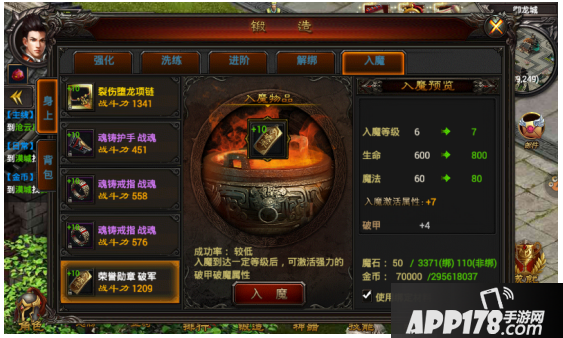 装备入魔可提升人物的生命、魔法、破甲、破魔及暴击等等属性。